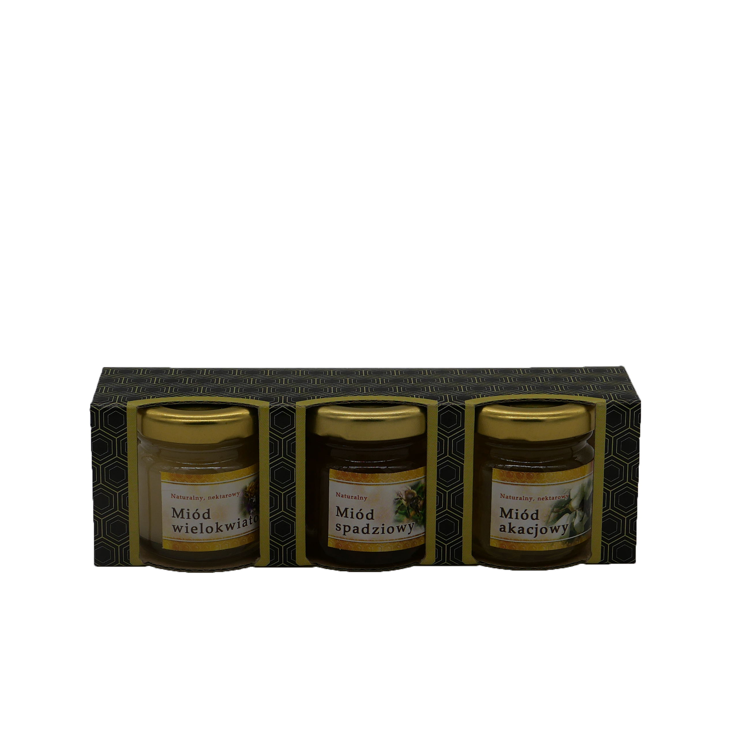 Wymień produkty wchodzące w skład zestawu, takie jak różne rodzaje miodu czy pyłek kwiatowy.